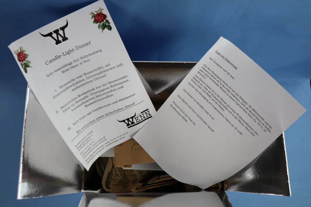 Sofern es nicht direkt mit der Steakbutique WENN abgestimmt ist, müssen wir spezielle Wünsche wenigstens 2 Tage im Voraus der Küche mitgeteilt haben, damit diese beim Wareneinkauf berücksichtogt werden können.