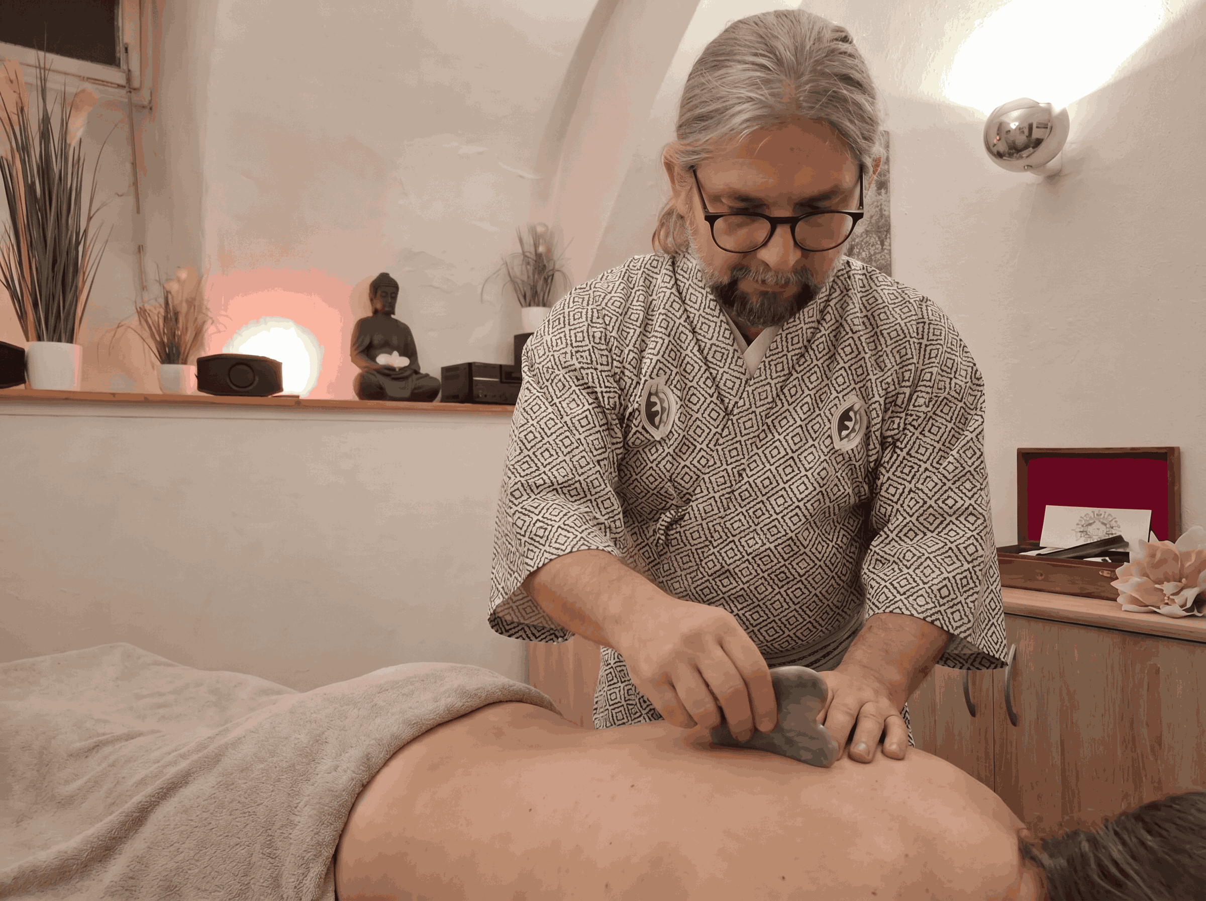 Mit Shiatsu-Techniken werden Nacken und Schultern gelöst: sanfter Druck entlang der Blasen- und Gallenblasenleitbahn, Punktarbeit an GB 20 und GB 21, das bekannte Halten des Nackens auf den Fingerkuppen. Danach werden die Meridiane mit gleichmäßigen Bewegungen der Schabe-Steine weiter gelockert.