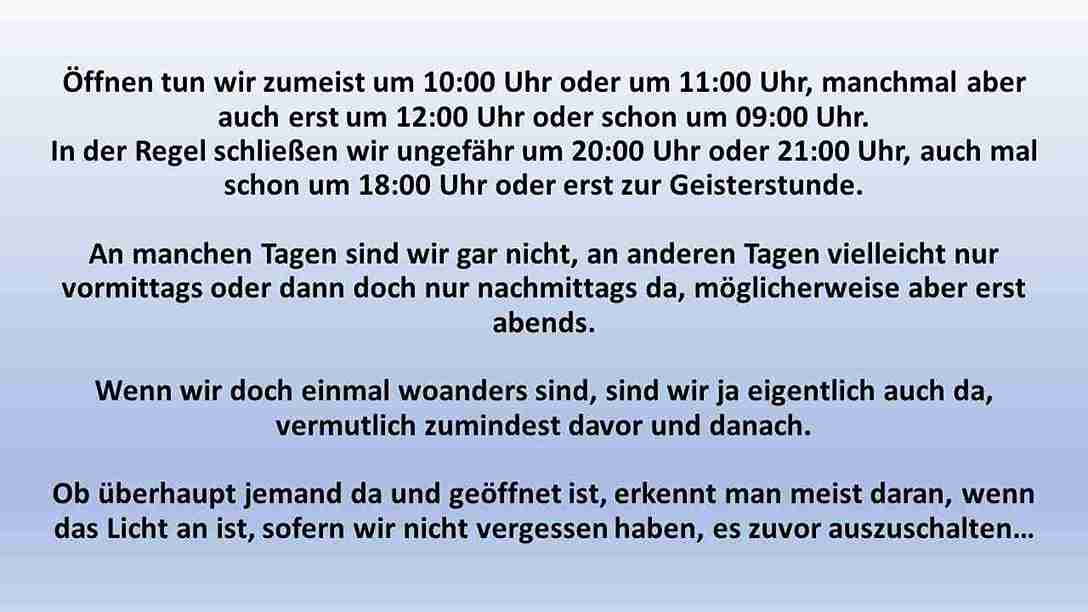- Der Auslastung und Personallage ist es leider momentan geschuldet, dass regelmäßig zu bestimmten Zeiten kein direkter Ansprechpartner für Sie vor Ort anwesend ist oder verfügbar sein kann.